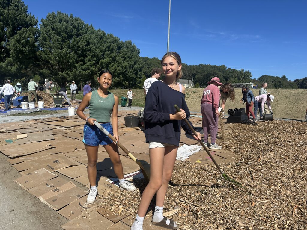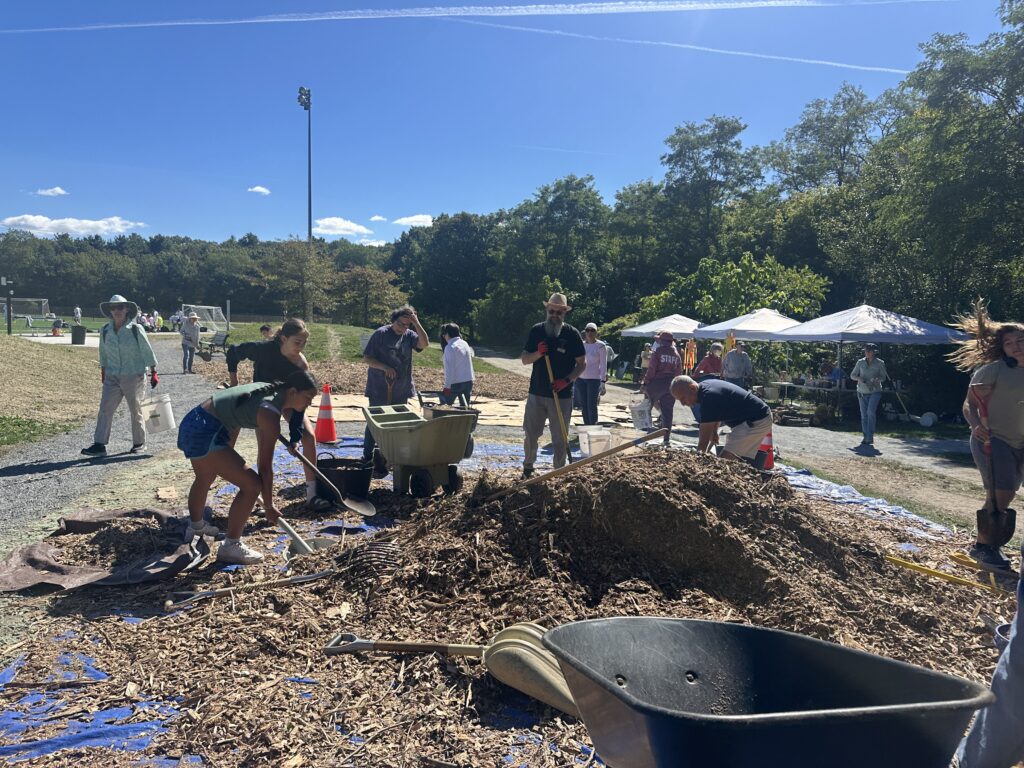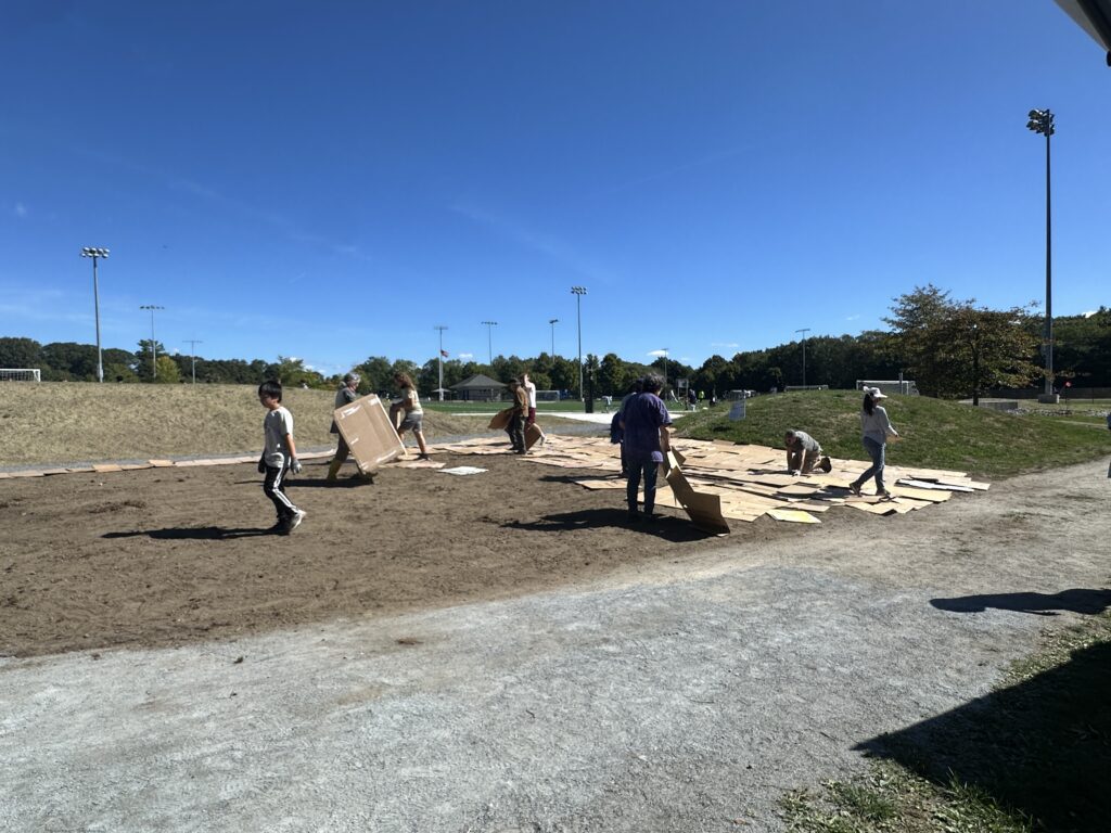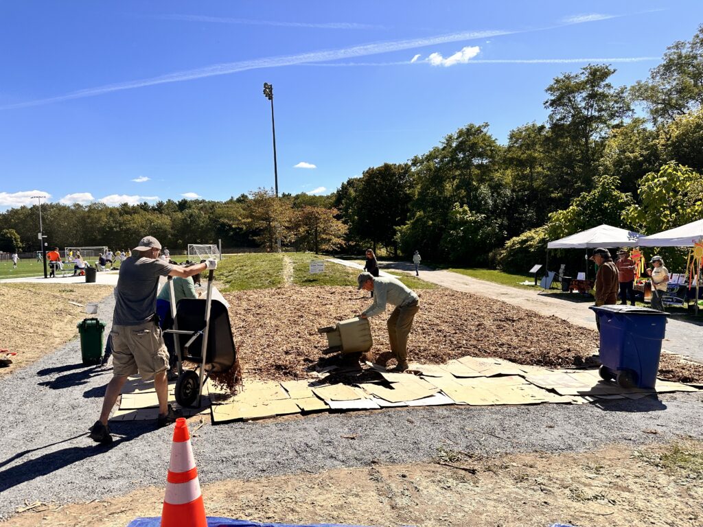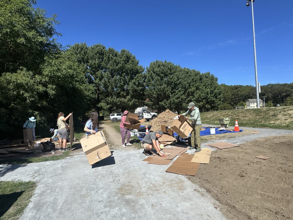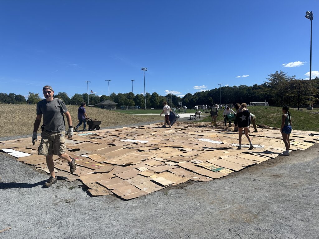 On September 20 we combined LexCAN’s Sun Day celebration with a soil-prep work party at Lincoln Fields. About 40 neighbors showed up. Using only hand tools, we laid clean cardboard to smother the tired turf and spread several inches of arborist wood chips on top. Both inputs are waste materials that can be repurposed to rebuild soil structure and retain moisture. With this many helpers, we were done in an hour!